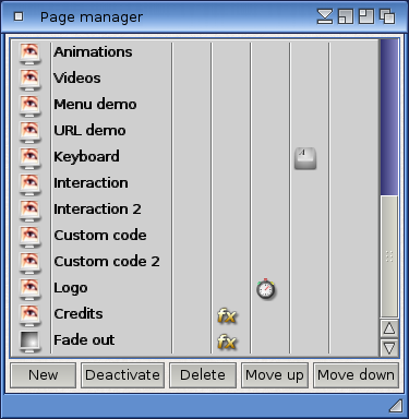 The second column displays the name of the page. If the name is printed in bold, it means that this page is activated. If the name is not in bold, then the page is deactivated and will not be displayed if you run your project. A double-click on the second column will open the page name dialog, which allows you to modify the page's name and identifier.