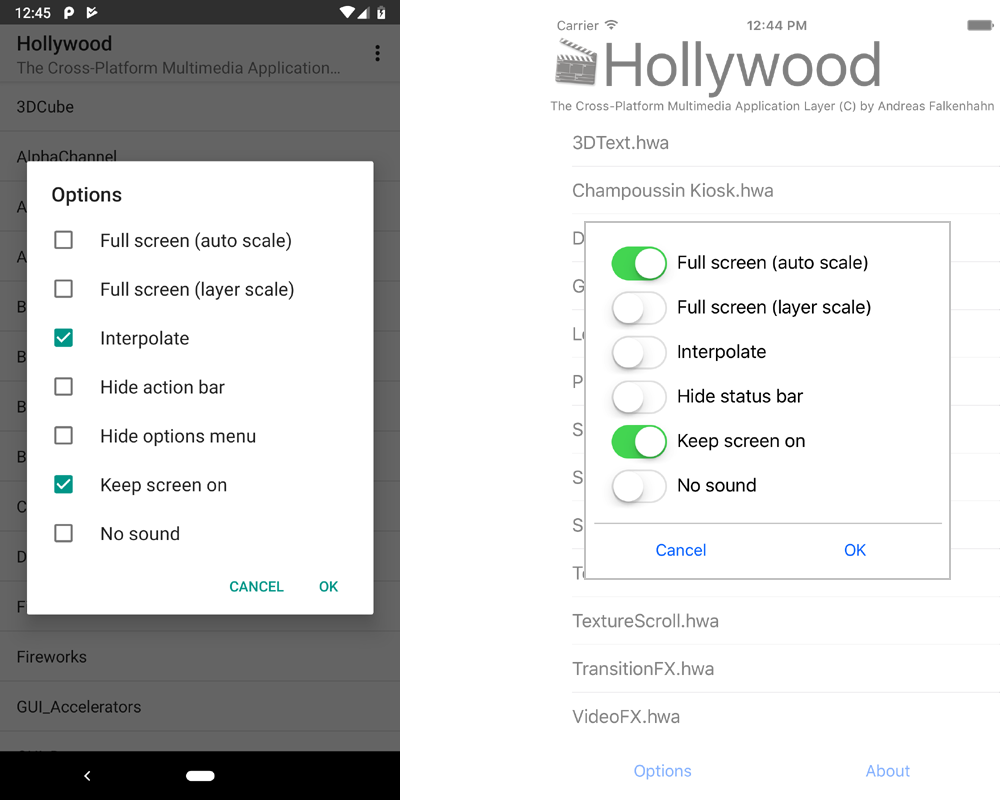 Hollywood is also available as a player-only version for Android and iOS which allows you to run your Hollywood applets on smartphones and tablets. The Hollywood Player for Android requires at least Android 4.0 and is freely available on Google Play at this URL: http://play.google.com/store/apps/details?id=com.airsoftsoftwair.hollywood. Unfortunately, the Hollywood Player for iOS is currently not available on the App Store because its capabilities seem to conflict with Apple's App Store rules.