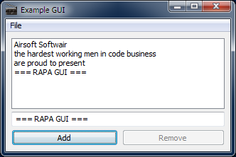 Welcome to the RapaGUI tutorial! This small step-by-step document will guide you through the process of creating your first GUI with RapaGUI in very few steps. We will create a little GUI application that consists of a listview, a text entry widget, and two buttons. The two buttons should be programmed to allow the addition and removal of items from the listview. The data to be inserted into the listview should be taken from the text entry widget. Here is what this little application looks like on Windows: