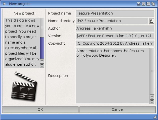 You can enter some information about your project in this dialog. Name, drawer, author, version, copyright and description can be entered. All entries are optional except name and drawer. These entries must be made. If the specified drawer does not exist, Hollywood Designer will create it automatically for you.