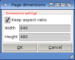 In this dialog you can modify the dimensions of a page. To modify the size of a page, you need to enter a new width and height and press "OK". If you have checked the widget "Keep aspect-ratio", Hollywood Designer will automatically calculate the correct second size so that the page will not be stretched.