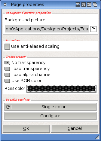 If the page type is "Picture", you will also be able to choose a transparency setting for the image. This can either be an RGB color, pen-based transparency in case the picture uses a palette, or alpha channel transparency for image formats that support alpha channels like PNG. If you specify a transparency option, you will also have to configure a backfill setting for this picture. The transparent image will then be composited onto the specified backfill setting. See the documentation of the project properties dialog for more information on backfill settings.