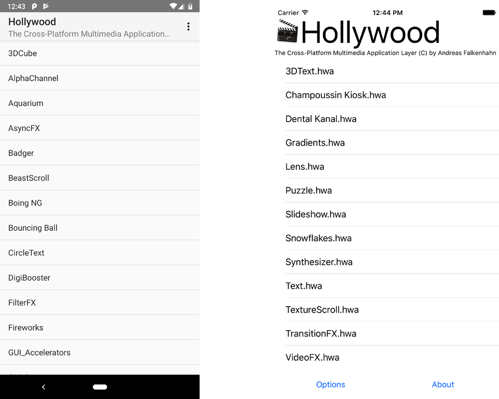 Hollywood is also available as a player-only version for Android and iOS which allows you to run your Hollywood applets on smartphones and tablets. The Hollywood Player for Android requires at least Android 4.0 and is freely available on Google Play at this URL: http://play.google.com/store/apps/details?id=com.airsoftsoftwair.hollywood. Unfortunately, the Hollywood Player for iOS is currently not available on the App Store because its capabilities seem to conflict with Apple's App Store rules.