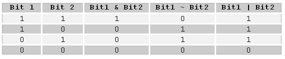 %10011001 & %11101000 = %10001000 ; Bitwise And %10011001 ~ %11101000 = %01110001 ; Bitwise Xor %10011001 | %11101000 = %11111001 ; Bitwise Or |