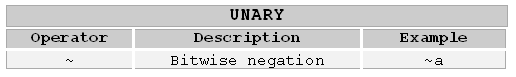 The unary negation operator (~) will do a bitwise inversion of the number it is used on. All bits will be inverted. Please note that the value will always be converted to a 32-bit integer before the inversion. Thus, you might get a lot of leading ones. For example: